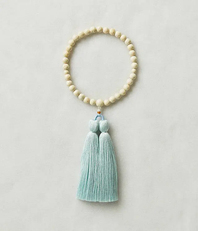 ホワイトに1滴だけグレイの絵の具を垂らしたような、くすみのあるアイボリーカラーが特徴のリバーストーン。水色の房との組み合わせが優しく、落ち着いた印象を与えます。サイズ違いで、ペアでお持ちいただくこともできます。