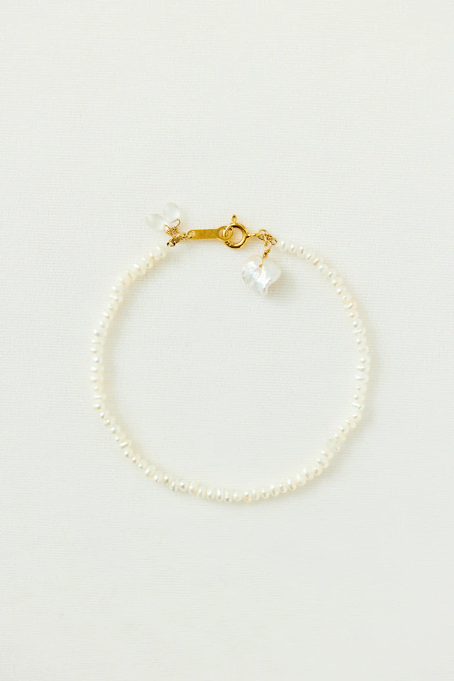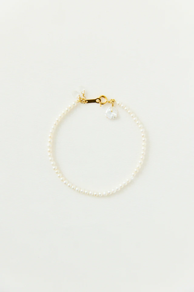 美しい純白の淡水パールを用いた4.5mm〜5mm珠のネックレス。シンプルなデザインで日常使いに活躍します。小さく輝くムーンストーンとケシパールを金具部分にあしらい、後ろ姿も素敵に演出します。