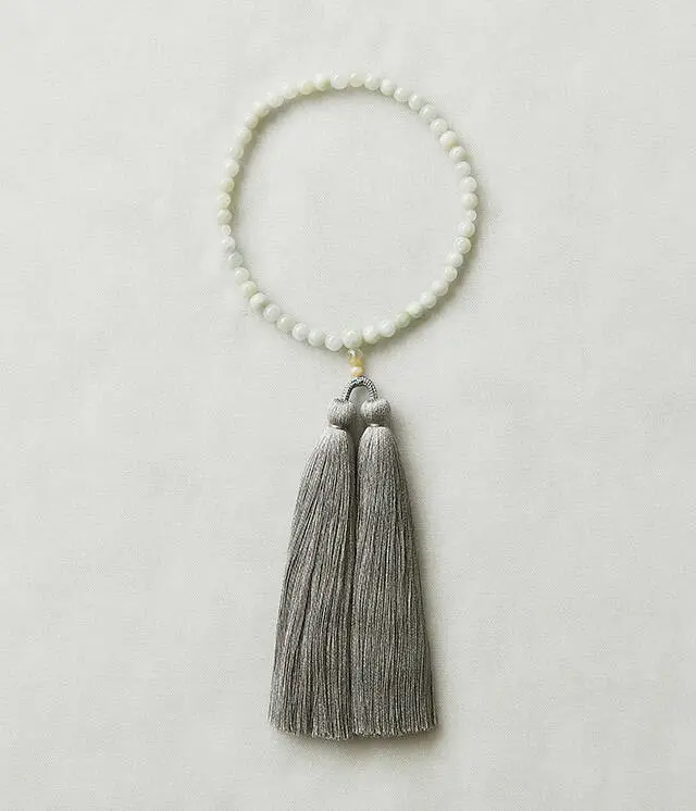 淡水パールの柔らかい白色と、水色のシルクの房を合わせた穏やかな印象のお数珠です。パールの持つ上品さと存在感が特徴的。シュオにとっても特別なお数珠になりました。